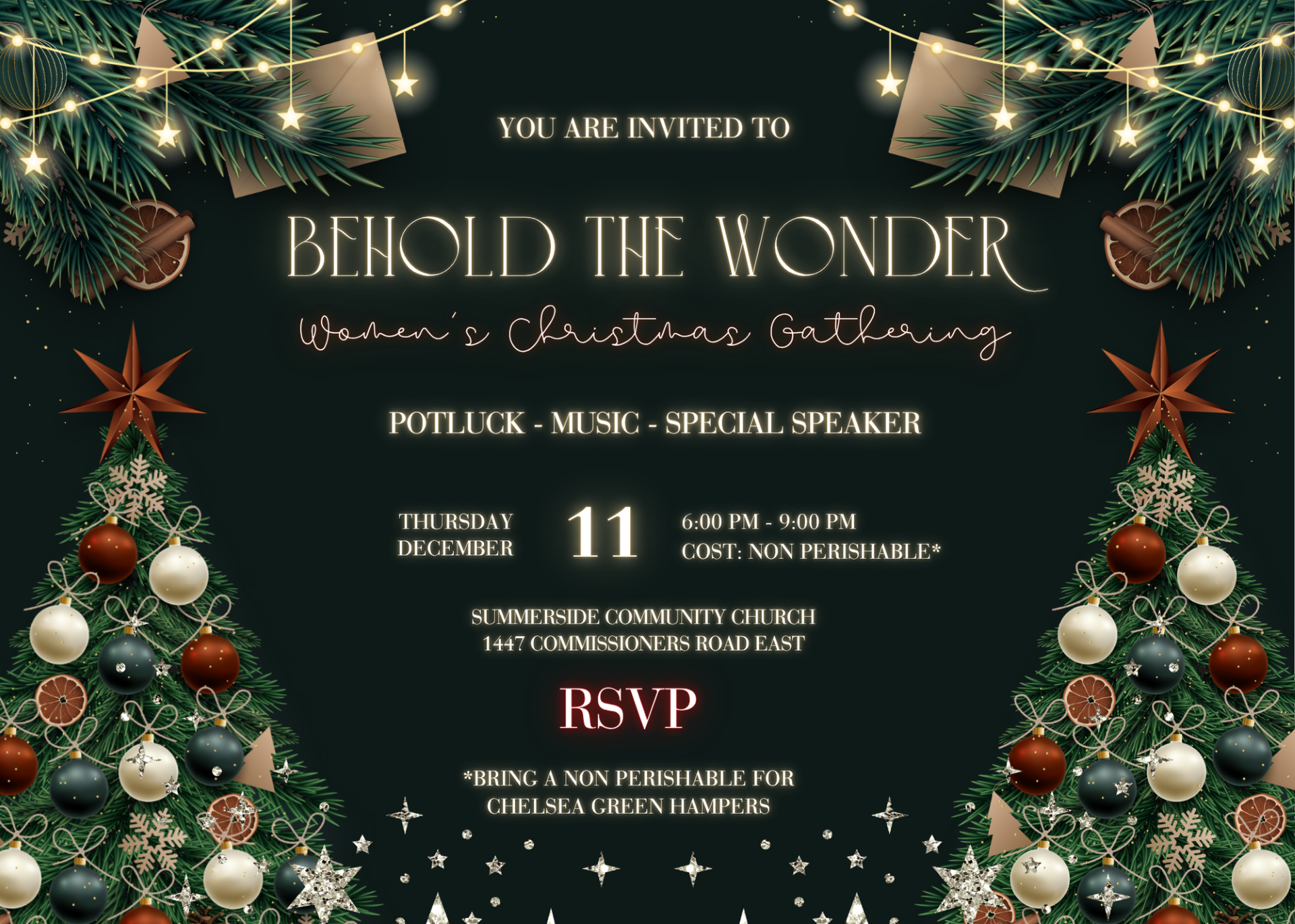 Join us for Behold the Wonder: Women’s Christmas Gathering on Thursday, December 11 at 6:00pm at Summerside Community Church. This is a special evening for all women of Summerside - a time to slow down, share a meal,
